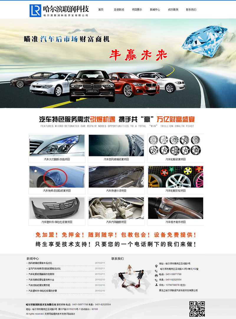 哈爾濱聯(lián)潤科技開發(fā)有限公司,是一家以:汽車大燈翻新/改色項目、汽車擋風玻璃修復項目、汽車輪轂修復項目、汽車免噴漆凹陷修復項目、汽車快速補漆項目、汽車輪轂彩繪項目、汽車塑料件/保險杠修復項目、汽車內飾翻新項目、汽車桃木制作項目為主的高科技汽車科研開發(fā)公司。